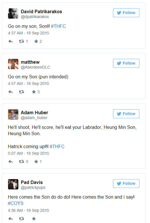 한편 현지 팬들은 손흥민의 영문 성 'Son' 을 '아들'로 직역하여 "Go on my son, Son" 으로 표현하는 등 손흥민의 활약에 고무 되었다.